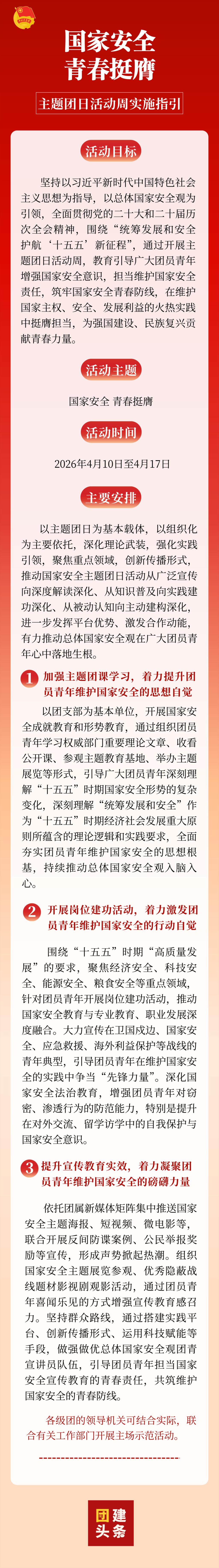 2026年是“十五五”规划的开局之年。为深入贯彻落实党的二十届四中全会精神,动员广大青年在护航“十五五”新征程中挺膺担当,在第十一个全民国家安全教育日来临之际,现就开展国家安全主题团日活动周提出实施指引如下。