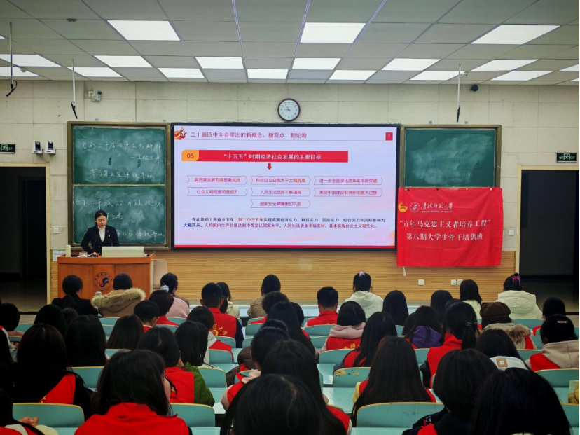 夜幕降临,城北校区东二楼101教室灯火通明,100余名同学齐聚一堂。第五组宣讲学员以“党的二十届四中全会”为主线,通过“重要地位—主要目标—青年使命”三维解读框架,用“案例 + 地域实践”的方式让抽象理论落地。