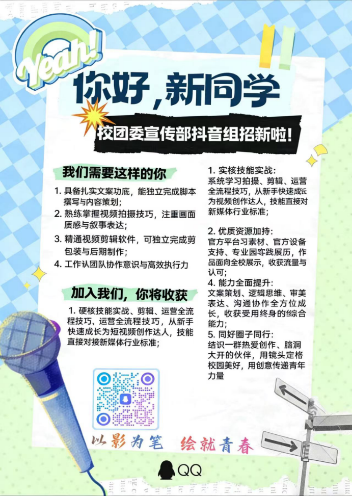 为进一步壮大校园宣传队伍,提升内容质量与传播力,校团委宣传部抖音组现面向校园公开招新,诚邀有能力、有责任心、有态度的同学加入!