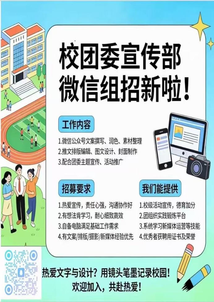 为进一步夯实校园宣传阵地,丰富校园文化传播形式,提升新媒体宣传质量与影响力,校团委宣传部微信组现面向全校招募新成员!我们期待认真负责、思维活跃、热爱宣传、乐于奉献的你,与我们一同讲好校园故事,传递青春正能量。