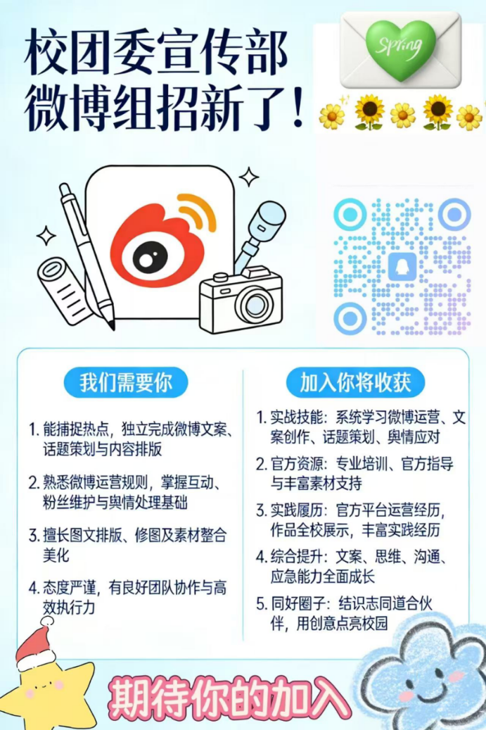 为进一步壮大校园宣传队伍,丰富校园文化传播形式,提升内容质量与影响力,校团委宣传部微博组现面向校园公开招新,诚邀有创意、有热情、有担当的同学加入!