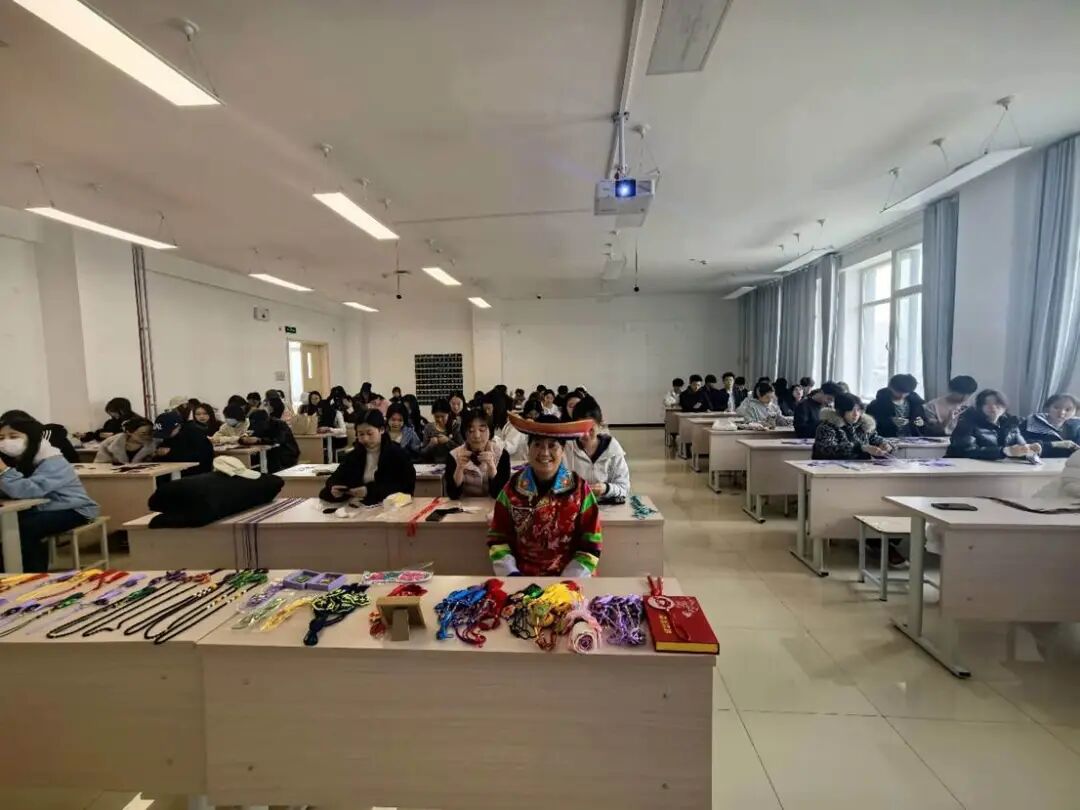 为引领青年学子深入了解中华优秀传统文化,增强文化自觉、坚定文化自信,亲身感受非物质文化遗产的独特魅力与匠心精神。3月18日下午,文学院在西一楼0236教室举办土族盘绣非遗进校园专题讲座。本次讲座邀请互助县土族盘绣非遗传承人王玉兰老师主讲,吸引了文学院、音乐学院、美术学院等同学踊跃参与,现场以“讲—演—练—答”四维联动模式,让土族盘绣这一高原非遗瑰宝,在师大校园里绽放出独特的光彩。