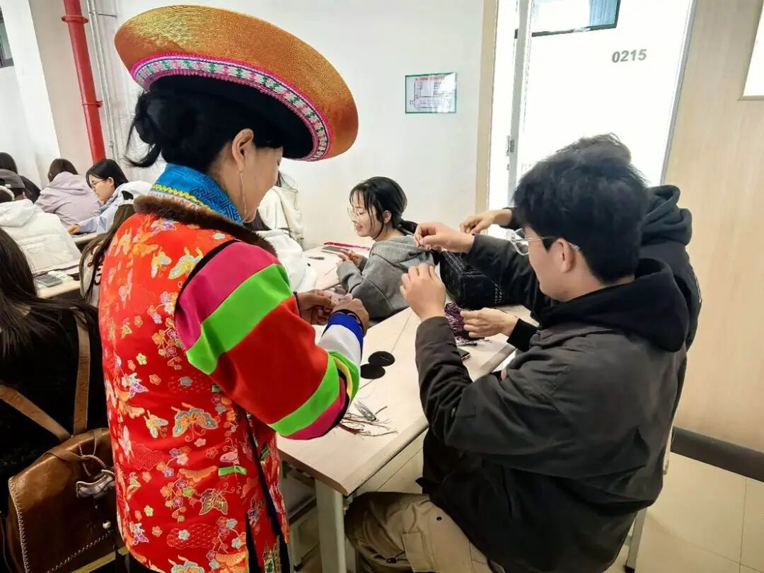王玉兰老师俯身手把手教学,从穿针引线的基础技巧,到针法运用的关键要点,逐一耐心指导。同学们凝神专注,在一针一线的穿梭中,触摸非遗技艺的肌理,感受传统手工的温度,体会“一针一线皆匠心,一朝一夕承文脉”的坚守与智慧。现场氛围热烈而温馨,指尖的丝线交织着青春的热忱,古老技艺在青年手中焕发出灵动的生机。