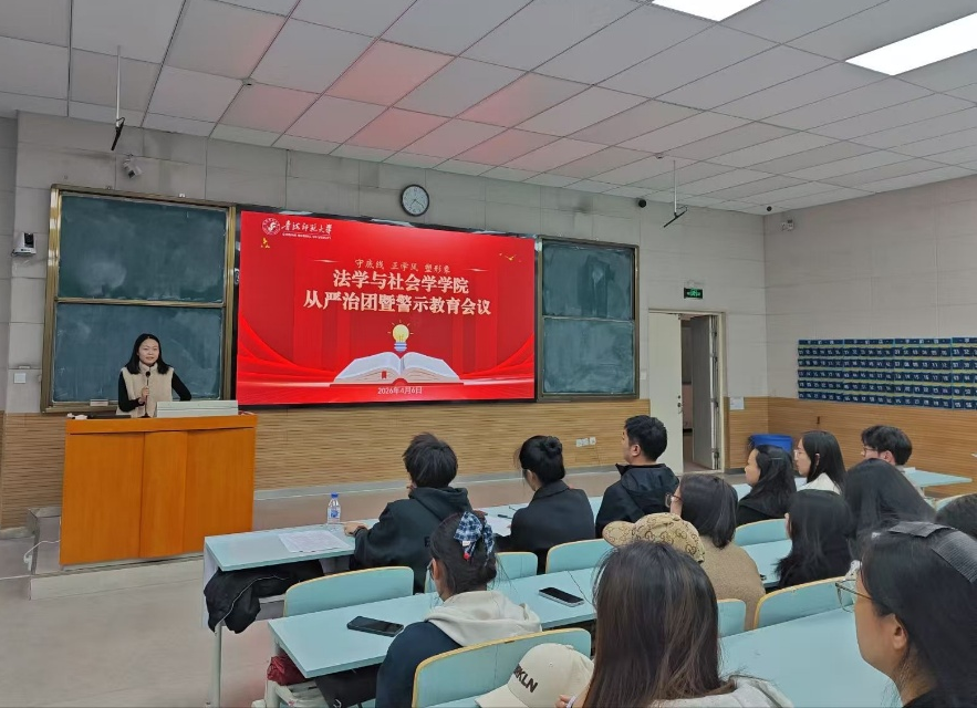 为深入落实全面从严治团要求,强化学生纪律意识与规矩意识,近日,法学与社会学学院面向2023级全体本科生召开“守底线 正学风 塑形象”从严治团暨警示教育会议。院党委副书记、校团委兼职副书记雍挺俊,院团委书记、各班班主任、全体辅导员及220余名学生参加。